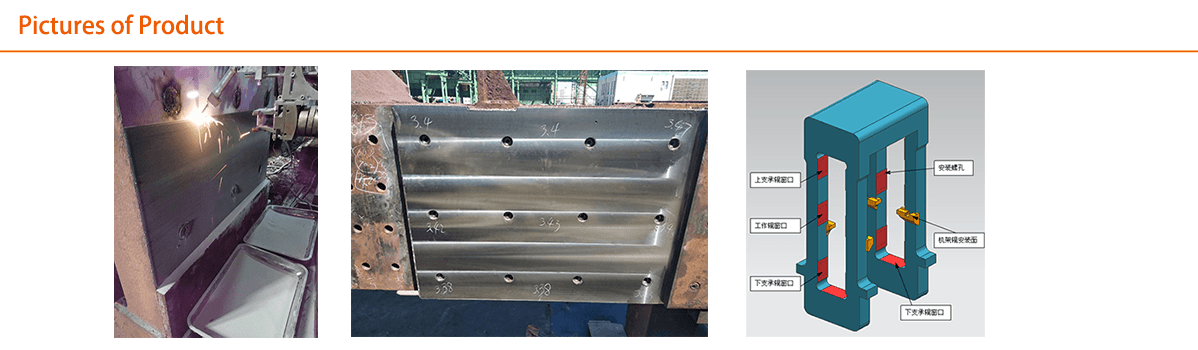 Rolling mill housing frame is also called rolling mill stand, which is used to install the roller, roller bearing, roller adjustment device, guide equipment, etc. and is also an important load-carrying component in the rolling equipment. It is usually made of ordinary steel castings and its casting process determines that the body surface does not have high strength, corrosion resistance and other performance. Continuous impact load results in permanent deformation of related fitting and mounting surfaces of the rolling mill, meanwhile, it is further deteriorated due to corrosion of the material, which results in inaccurate positioning of the working roll and the backup roll and excessive movement of the roll bearing chock in the rolling mill stand, making it difficult to effectively control the clearance between the rolling mill housing frame and the roll bearing chock.