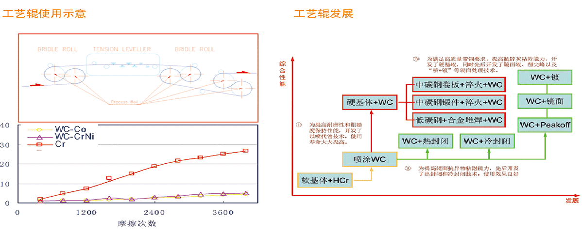 層流冷卻輥産品應用于熱軋帶鋼生産線,位于精軋機與卷取機之間。通過水冷來控制帶鋼溫度,保證卷取的正常進行,主要分爲内冷輥和外冷輥。在熱軋機組運行時,高溫、高速的熱軋闆與輥子接觸摩擦,同時輥面承受循環水反複沖蝕冷卻。傳統的層流冷卻輥主要失效形式有輥面磨損、腐蝕,輥面剝落,輥子傳動鏈失效等。