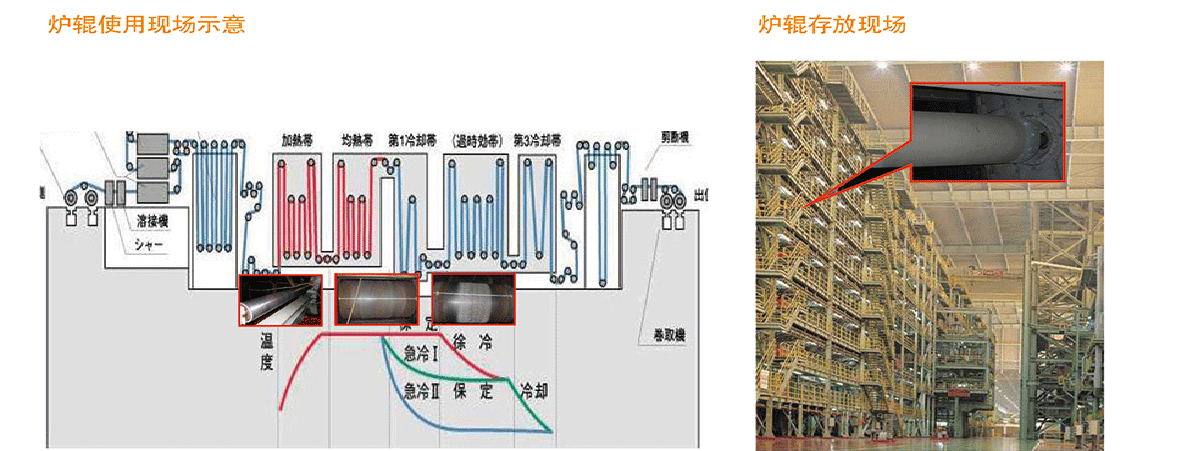 爐輥是冷軋連續退火機組及連續熱鍍鋅機組退火爐中的核心部件。由于長期在高溫下服役,因此其表面塗層除了要具備強度高、抗高溫氧化腐蝕性能強、抗熱震性能優等良好的高溫性能外,更重要的是要具備優異的抗積瘤(普通鋼的Fe積瘤和高強鋼的Mn積瘤)以确保帶鋼的質量、長期的粗糙度保持性能以保證爐内張力的建立。泰爾表面采用先進的超音速火焰和等離子弧等連續噴塗技術,所制作的高溫超合金+陶瓷塗層具有使用壽命長、性價比高等優點,先進的後處理設備和技術可制備各種輥型和不同粗糙度的爐輥。